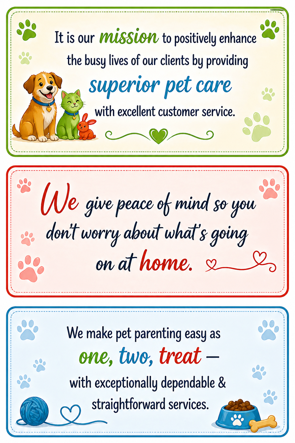 Visit lengths: Our drop-in visits are tailored to meet your pet’s needs, with options available for 15, 30, 45, or 60 minutes. For longer stays, we offer hourly sitting services ranging from 1 to 3 hours. Any visit exceeding 3 hours will be classified as 'daycare' and billed at a different rate.