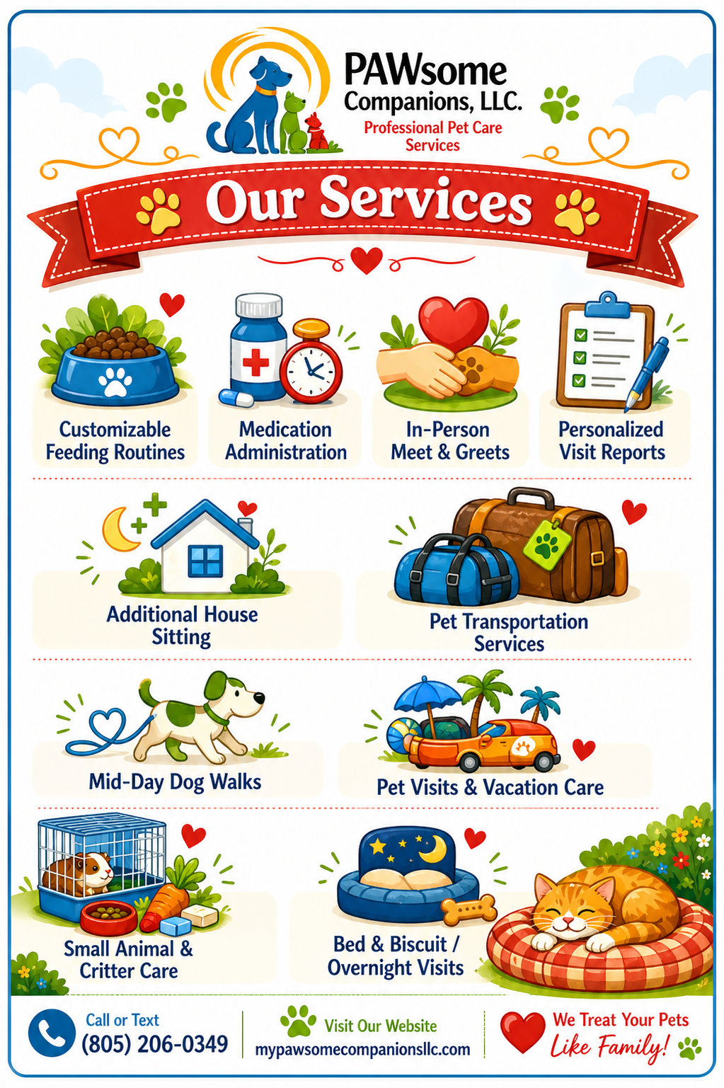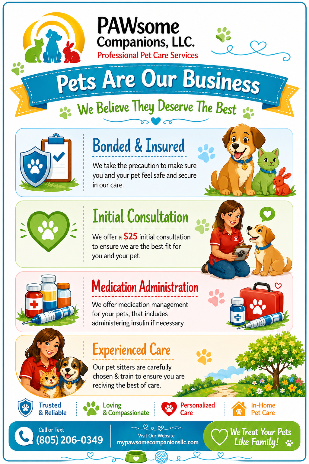 Founded part-time in 2017 and proudly operating as a full-time LLC since 2023, PAWsome Companions has earned the trust of families across Simi Valley, Ventura County, and Los Angeles County through years of dependable service and heartfelt care. We don’t rush visits. We don’t cut corners. And we never treat your pet like just another booking. We take the time to build real relationships with both pets and clients, creating a consistent, low-stress experience that pets quickly come to recognize and trust. We also respect your home as much as your pet. Our caregivers follow detailed home-care instructions, maintain professionalism at all times, and treat your space with care and discretion. Your privacy, security, and peace of mind matter.
