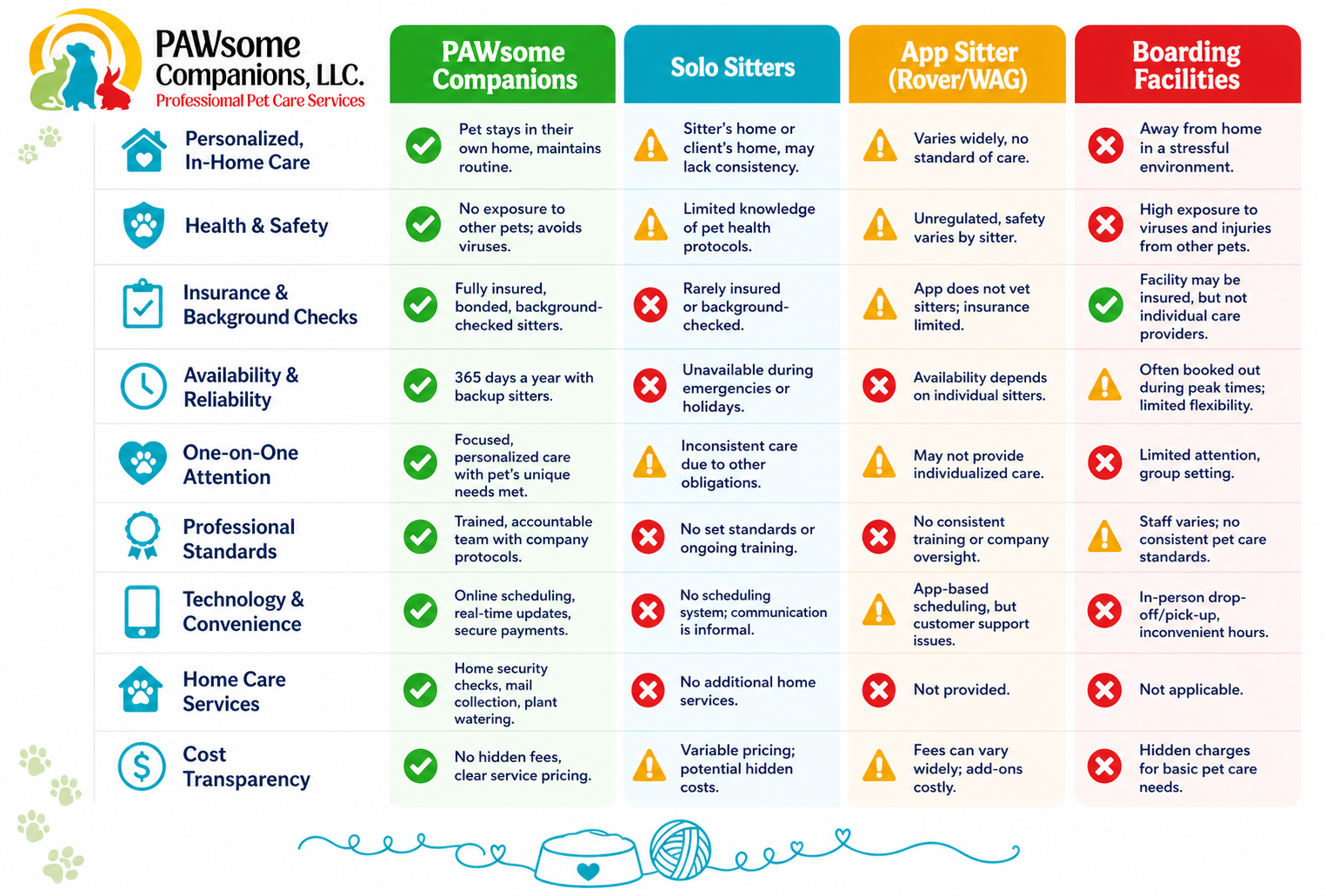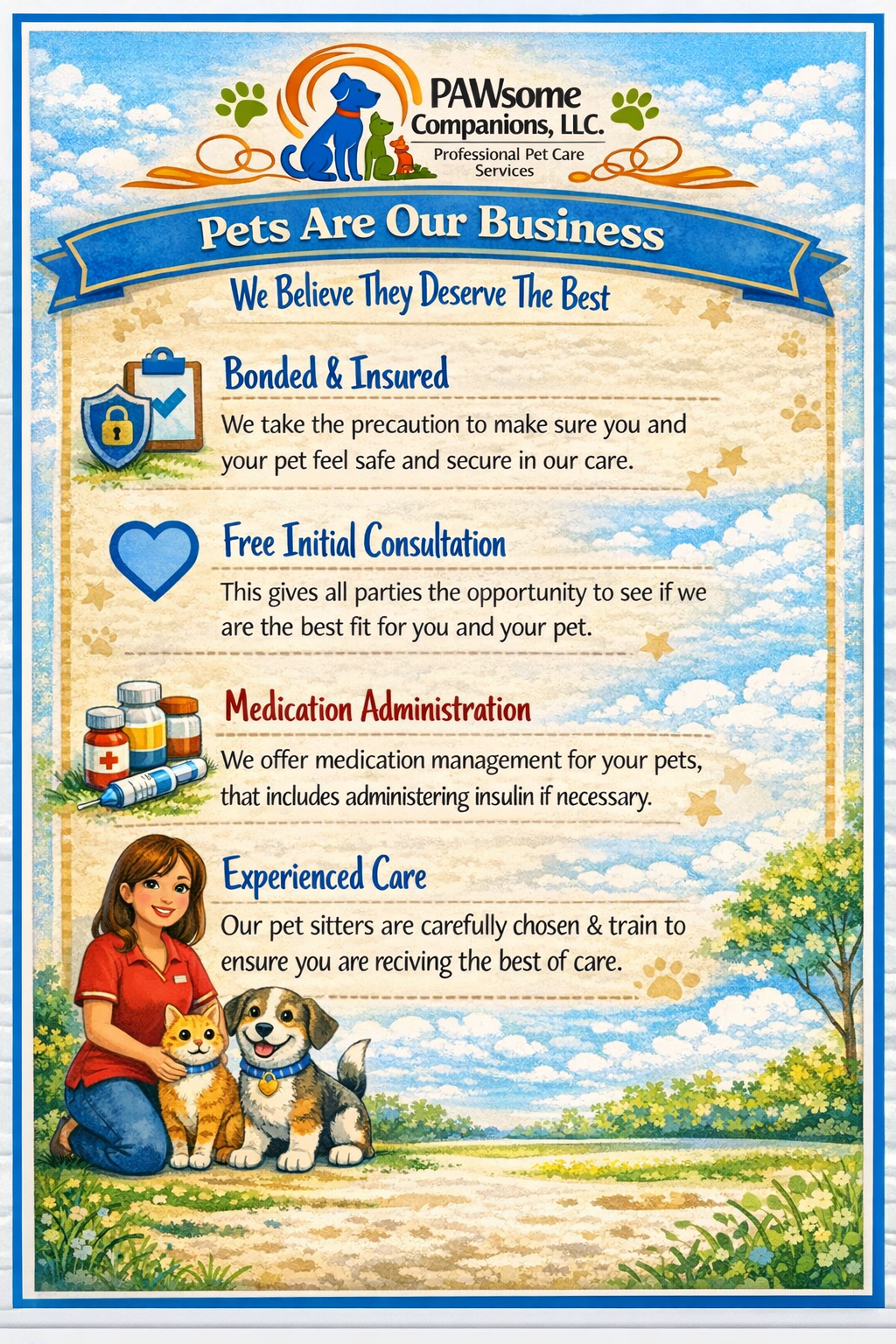 Unlike app-based platforms or gig sitters, PAWsome Companions is a dedicated local business built on reliability, accountability, and long-term client relationships. You’ll never wonder who is caring for your pet—we carefully match pets with trusted caregivers and maintain consistent service whenever possible. From the first visit to ongoing care, we focus on continuity, communication, and quality. We offer flexible scheduling, customized care plans, and clear communication every step of the way. After each visit, you’ll receive detailed visit reports and photo updates, so you always know how your pet is doing. We also provide medication and insulin administration at no additional cost, giving you confidence that your pet’s health needs are handled safely and correctly.