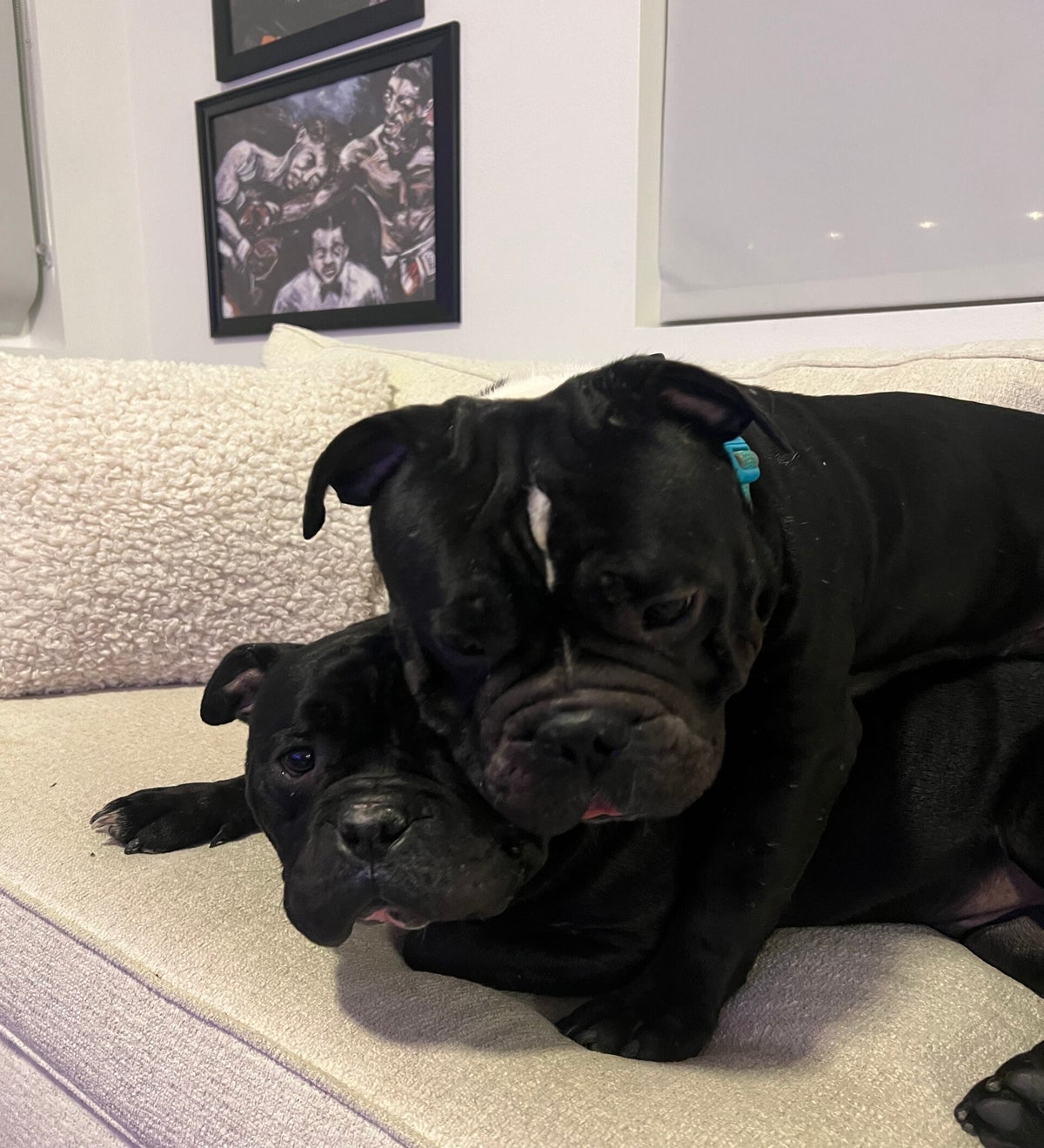 A dog who is lying down with their head on their paws will have a closed mouth, which always makes them look less happy. The eyebrows often move as the dog looks around, which can make a dog look pensive; the dog doesn’t look energetic, which can be confused with sad.
