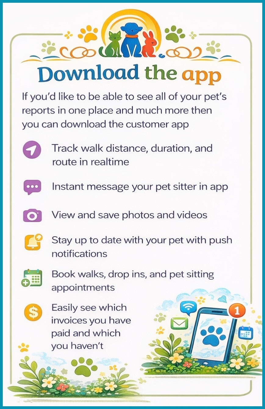 Walkies allows us to communicate clearly and document every visit, so you can feel confident knowing exactly how your pet is doing—even when you’re away. This technology helps us deliver consistent, professional, and personalized care while giving you peace of mind and full visibility into your pet’s experience with us.