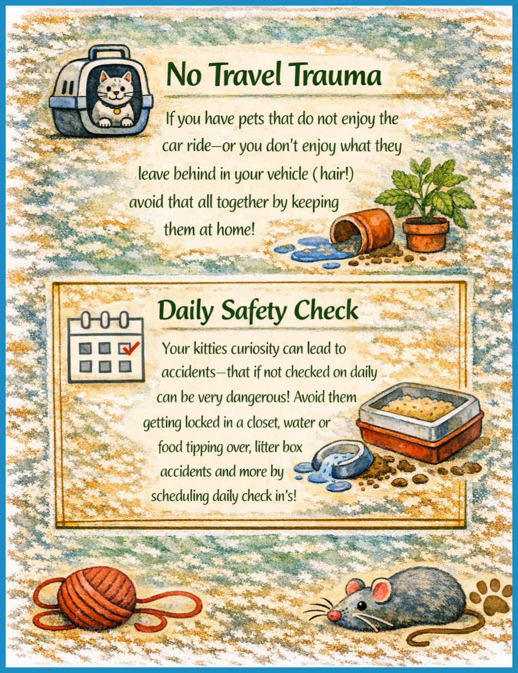Each of our sitters is an experienced professional and a true cat lover, ensuring your pet gets the best care possible. From fresh food and water to a spotless litter box and plenty of affection, we’ll make sure your furry companion stays happy and comfortable. Whether you’re heading out for the day or need someone to check in while you're at work, you can count on us to be there when you can’t. Rest assured—your kitty is in loving, reliable hands. We’ll treat them like they’re part of our own family, so you can relax and enjoy peace of mind while you’re away.